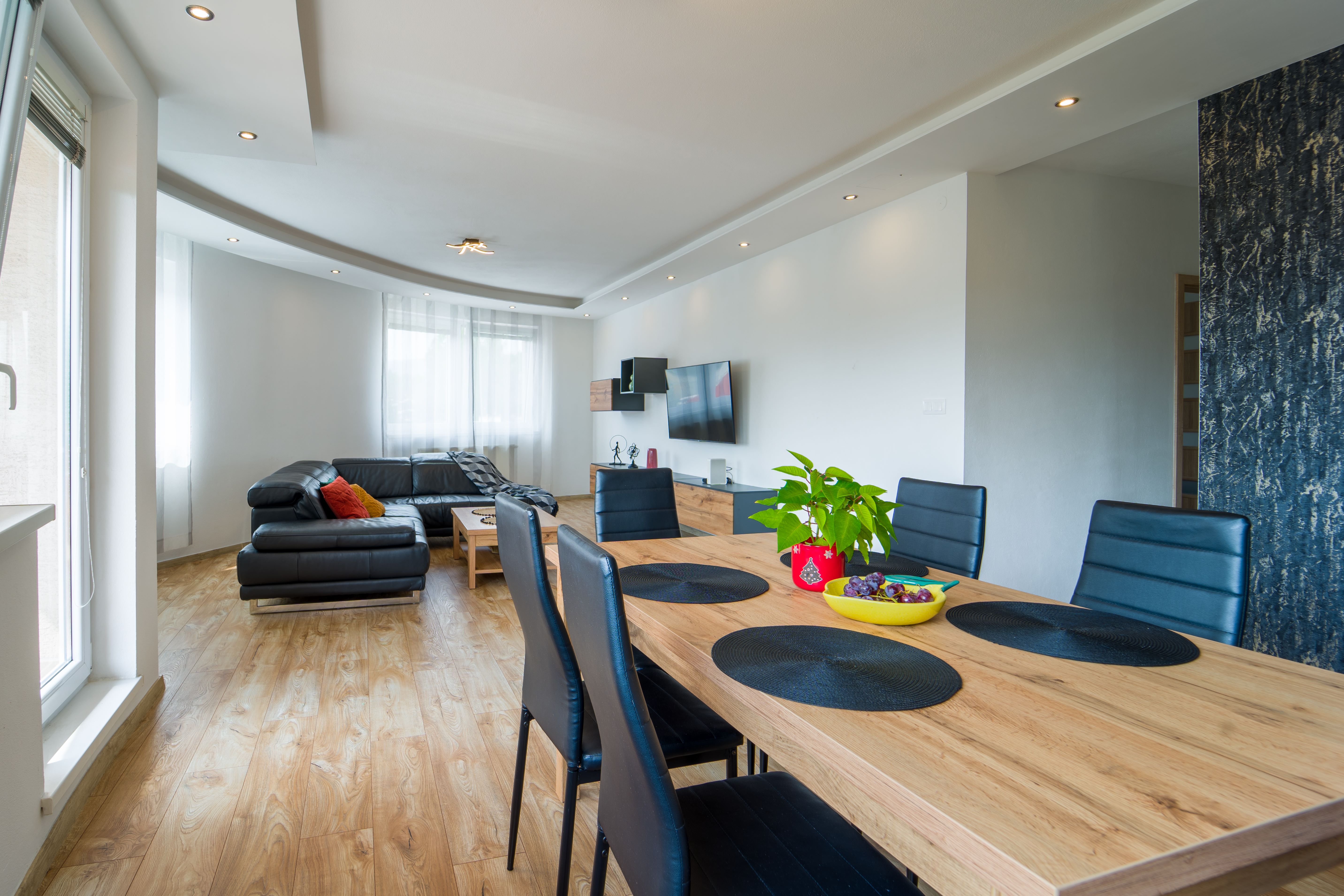 Pri vstupe nájdete množstvo odkladacieho priestoru na šatsvo, botník a zrkadlo. Srdce domu tvorí otvorený koncept kuchyne prepojenej s obývačkou, ktorá je vybavená nábytkom na mieru, kvalitnými značkovými spotrebičmi, jedálenským setom, sedacou súpravou, konferečným stolíkom a TV nábytkom. Krytý balkón je dostupný z dennej časti. Práve tento veľkorysí priestor je možné čiastočne alebo úplne oddeliť pre vytovorenie ďalšej izby vďaka viacerým oknám v miestnosti. Spálňa so širokou manželskou posteľou, nočnými stolíkmi a vlastným šatníkom je pripravená pre Vaše pohodlie. Kúpelňa so sprchovým kútom aj vaňou a umývadlovou skrinkou poskytuje dostatok priestoru, oceníte samostatne oddelenú toaletu s vetraním. Byt disponujúci výhľadmi na mesto sa nachádza na 2. poschodí mladého bytového domu s výťahom. Prešiel kvalitnou komplexnou rekonštrukciou v roku 2021 pri ktorej získal nové podhľady, podlahy, obklady, dlažby, sanitu a kuchynskú linku so vstavanými spotrebičmi.